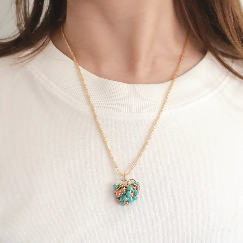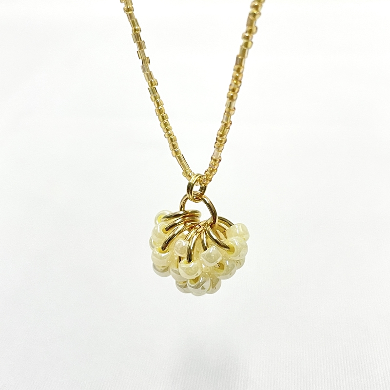 人気シリーズ ” Berry ” からネックレスが登場しました。ごろっと大きなビーズで果実を表現したモチーフと ネックレスチェーンにはM.G.B.のシードビーズがあしらわれた高級感あるデザインです。ピアスと同色アンサンブルにしたり、ワンポイント使いにしてみたりと色々な楽しみ方ができます。