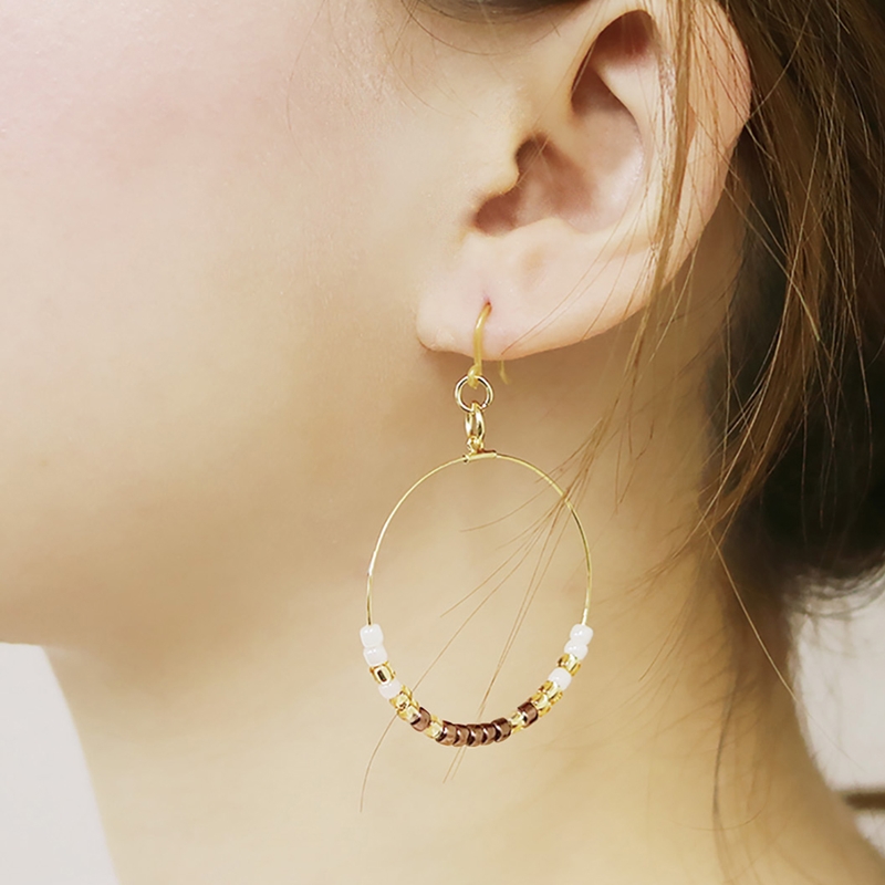 ゴールドのメタルフープがビーズ一粒一粒が持つ美しさをよりフィーチャー。フィニッシュに至るまでの全てを国内で行う。