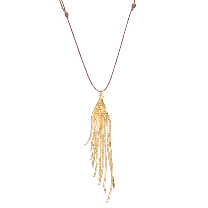 羽根の形状に着想を得たフェザーシリーズ。長くとられたビーズフリンジが揺れる度に輝きます。細めのネックレスコードを用いているため軽やかな仕上がりです。
