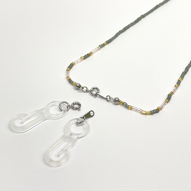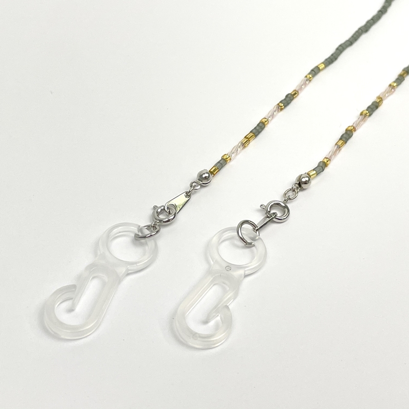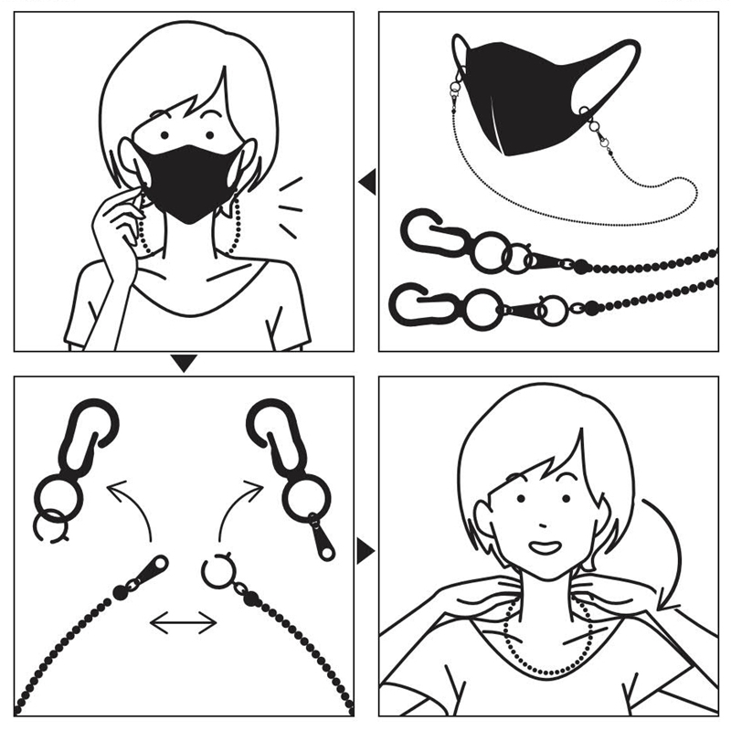 顔から取り外したマスクの置き場に困らないマスクチェーン。アイデアフックでつけ外しラクラク。さまざまなゴム幅のマスクに幅広く対応しています。